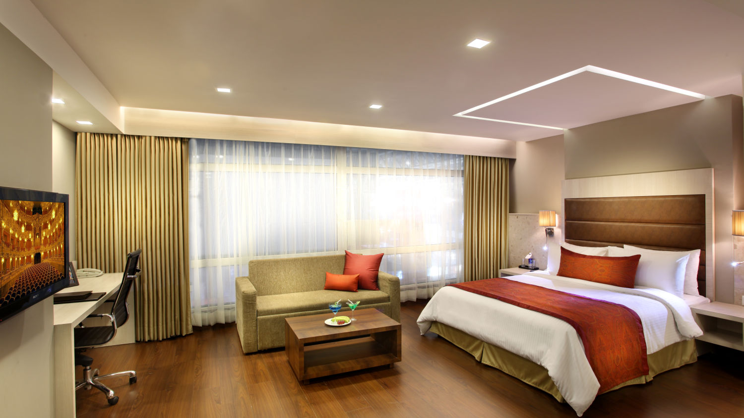 Hotel Facilities 5 categories of rooms that are stylish and considerably larger than all nearby hotels All the rooms come equipped with a kitchenette to help cook your own meals 2 dining options: an all-day dining restaurant and a rooftop restaurant 4 banquet halls Rooftop swimming pool Gym Spa Travel desk