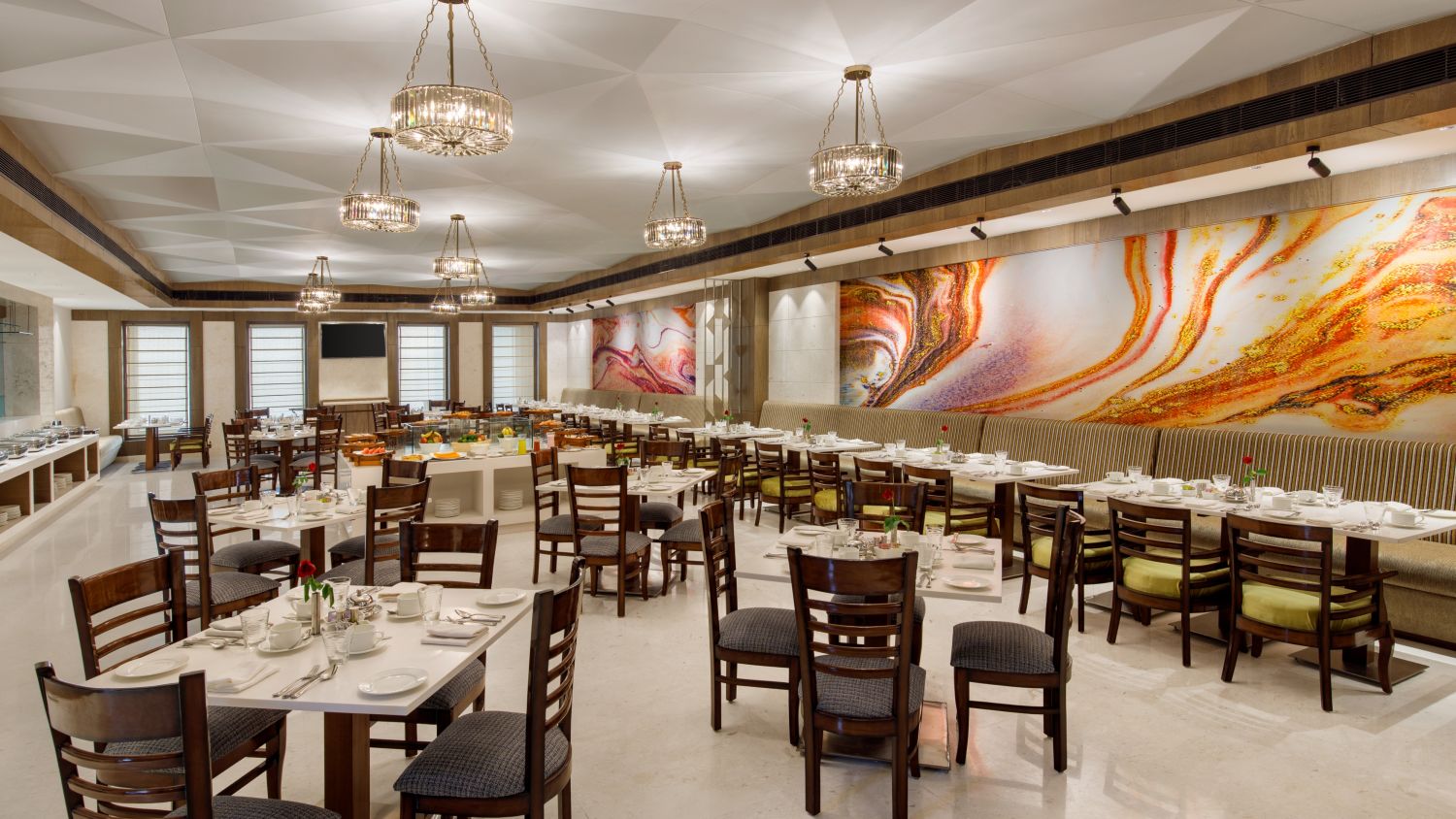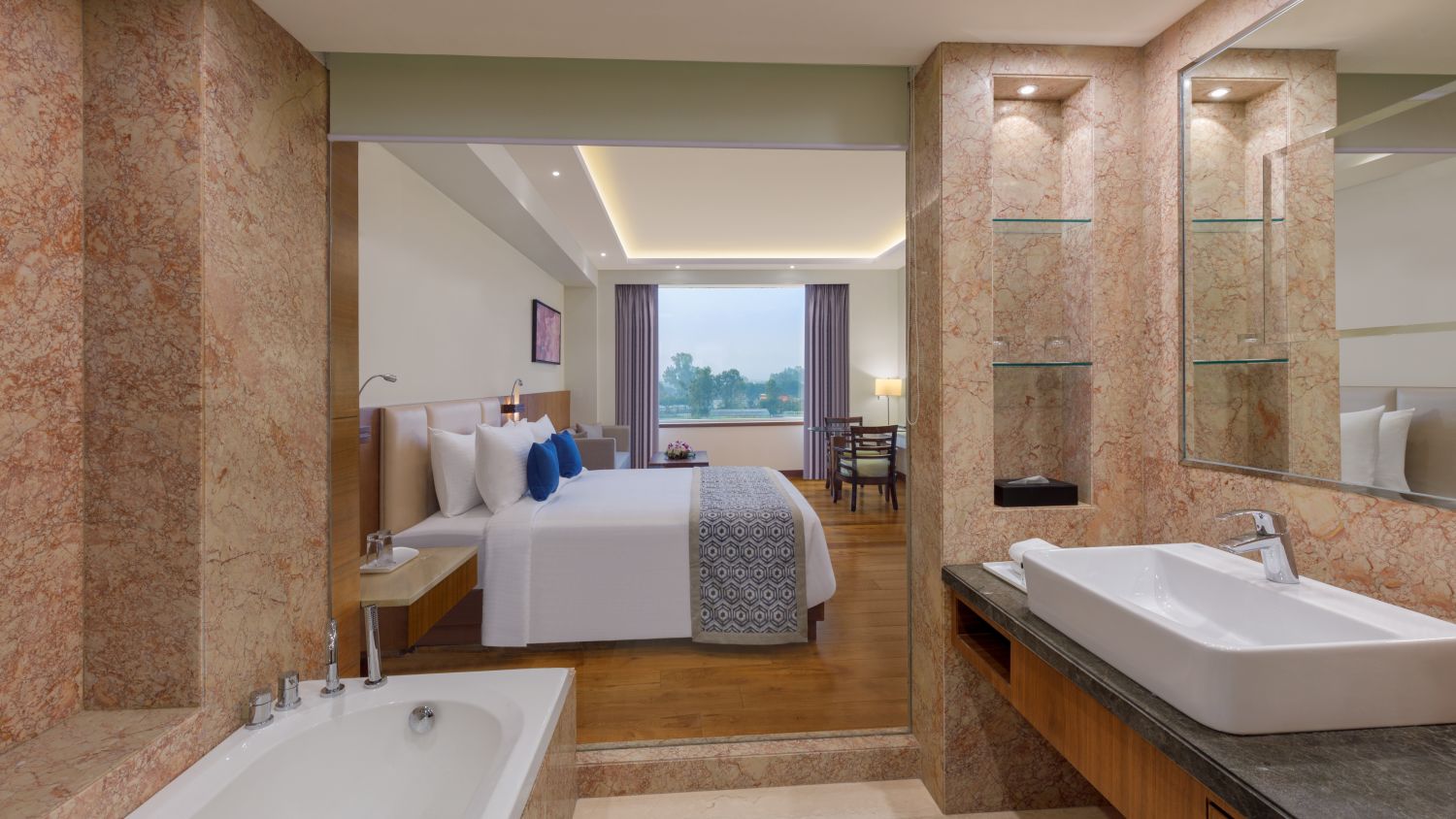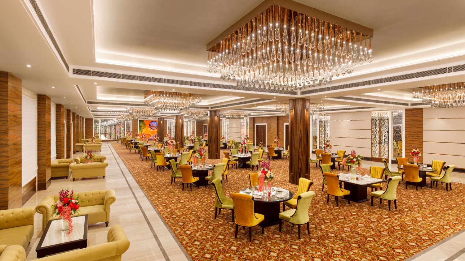 Viraj Sarovar Portico is a contemporary hotel located in the heart of Jammu. It is a stupendous structure that houses vast banquet halls and offers pleasant views. Viraj Sarovar Portico is just 12 kilometres away from Jammu Airport and can be reached within 25 minutes via road. Our hotel in Jammu is located just a few minutes from the National Highway and is close to Industrial hubs like SIDCO and Bari Brahmana. Our hotel accommodates one of the largest wedding halls in Jammu and has ample parking space that can accommodate close to 500 vehicles. Additionally, it comes with pleasing rooms, grand banquet halls, attentive service, well-equipped board rooms, and a range of in-house restaurants. Our four banquet halls in Jammu measure between 2300 sq. ft. and 31162 sq. ft. and are ideal for hosting small functions to royal weddings, music festivals, corporate retreats, and much more. The three in-house restaurants, Flavours, Zing, and Terrace Grill serve a range of multi-cuisine delicacies, finger food, and much more. Terrace Grill offers Tex-Mex cuisine and alcoholic beverages that will treat your tastebuds.